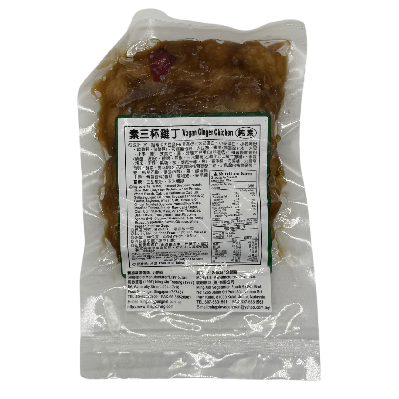 Water, Textured Soybean Protein (Soy Protein, Wheat Starch), Isolated Soybean Protein (Non-GMO), Wheat Gluten, Sugar, Salt, Ginger, Ginger Juice, Soy Sauce (Water, Soybean, Wheat, Salt, Sugar, Black Bean), Black Soy Sauce, Maltose, Sesame Oil, Corn Starch (Non-GMO), Glucose, Vegetarian Oyster Sauce (Water, Soybean, Wheat, Salt, Sugar), Potato Starch, Vegetarian Flavor, Vegetarian Seasoning. 水、組織狀大豆蛋白(大豆蛋白、小麥澱粉)、單離大豆蛋白(非基因改造)、小麥蛋白、糖、鹽、薑、薑汁、醬油(水、大豆、小麥、鹽、糖、黑豆)、黑醬油、麥芽糖、麻油、玉米澱粉(非基因改造)、葡萄糖、素蠔油(水、大豆、小麥、鹽、糖)、太白粉、素食香料、素食調味料。
