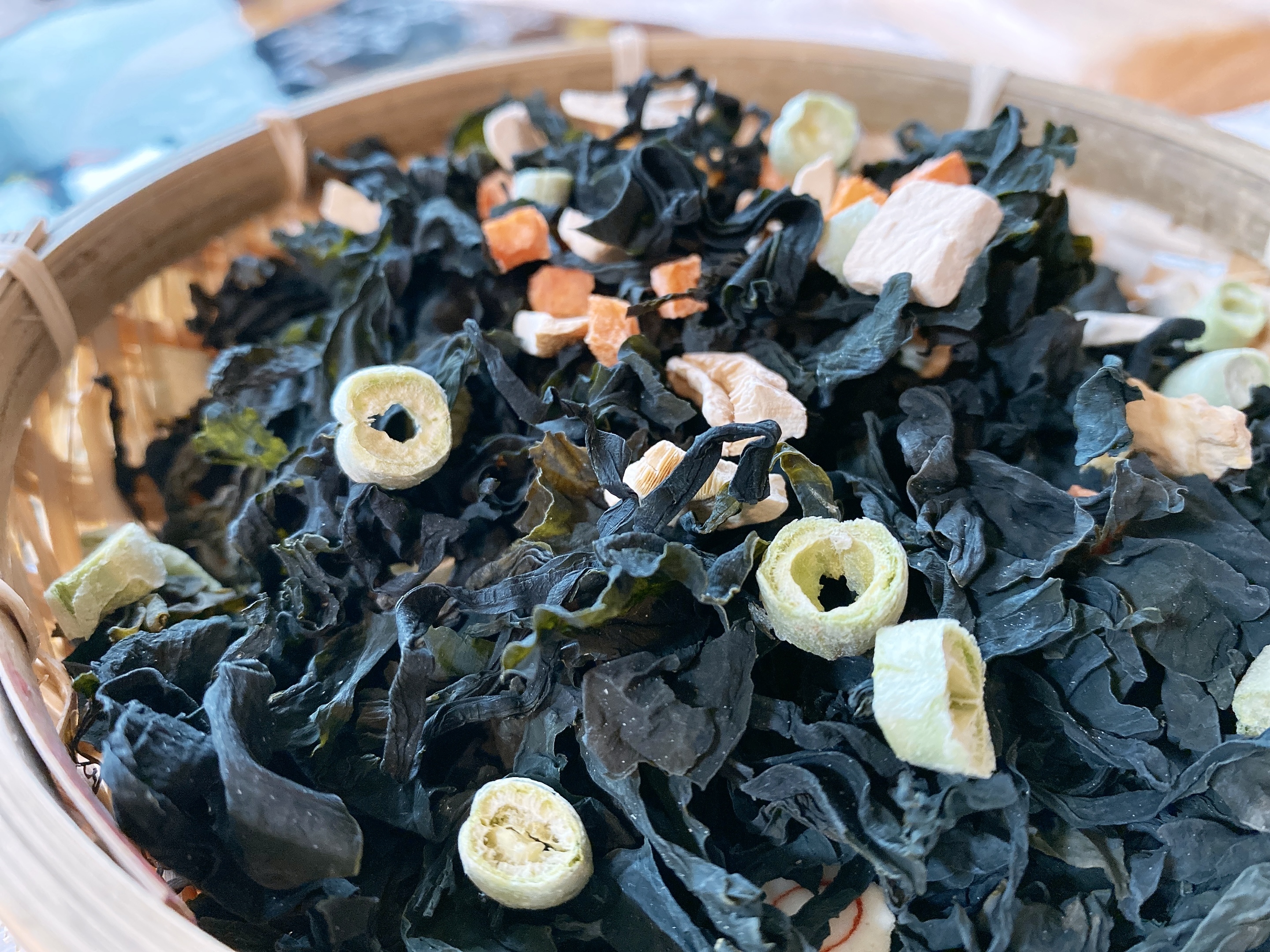 裙帶菜、碗豆、紅蘿蔔、蘑菇、金針
